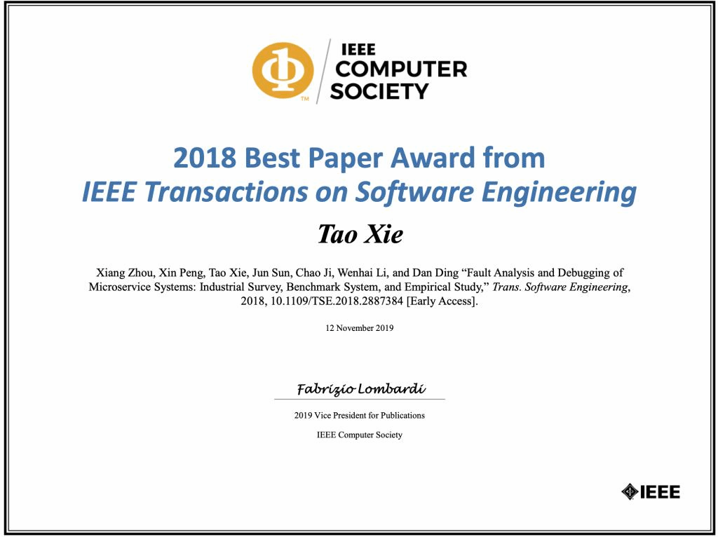 A recent paper "Fault Analysis and Debugging of Microservice Systems: Industrial Survey, Benchmark System, and Empirical Study" published by the CodeWisdom team led by Prof. Xin Peng from Fudan University and jointly by Prof. Tao Xie from Peking University and Prof. Jun Sun from Singapore Management University, won the inaugural IEEE Transactions on Software Engineering (TSE) Best Paper award for 2018, which was selected from the 109 papers accepted by TSE in 2018. A selection committee followed a rigorous process in making its determination. This award is part of a Best Paper Award Program started in 2019 and sponsored by the IEEE Computer Society. The objective of this program is to acknowledge and reward the best articles published in the previous year in each Transactions and Magazine fully sponsored by the IEEE Computer Society.