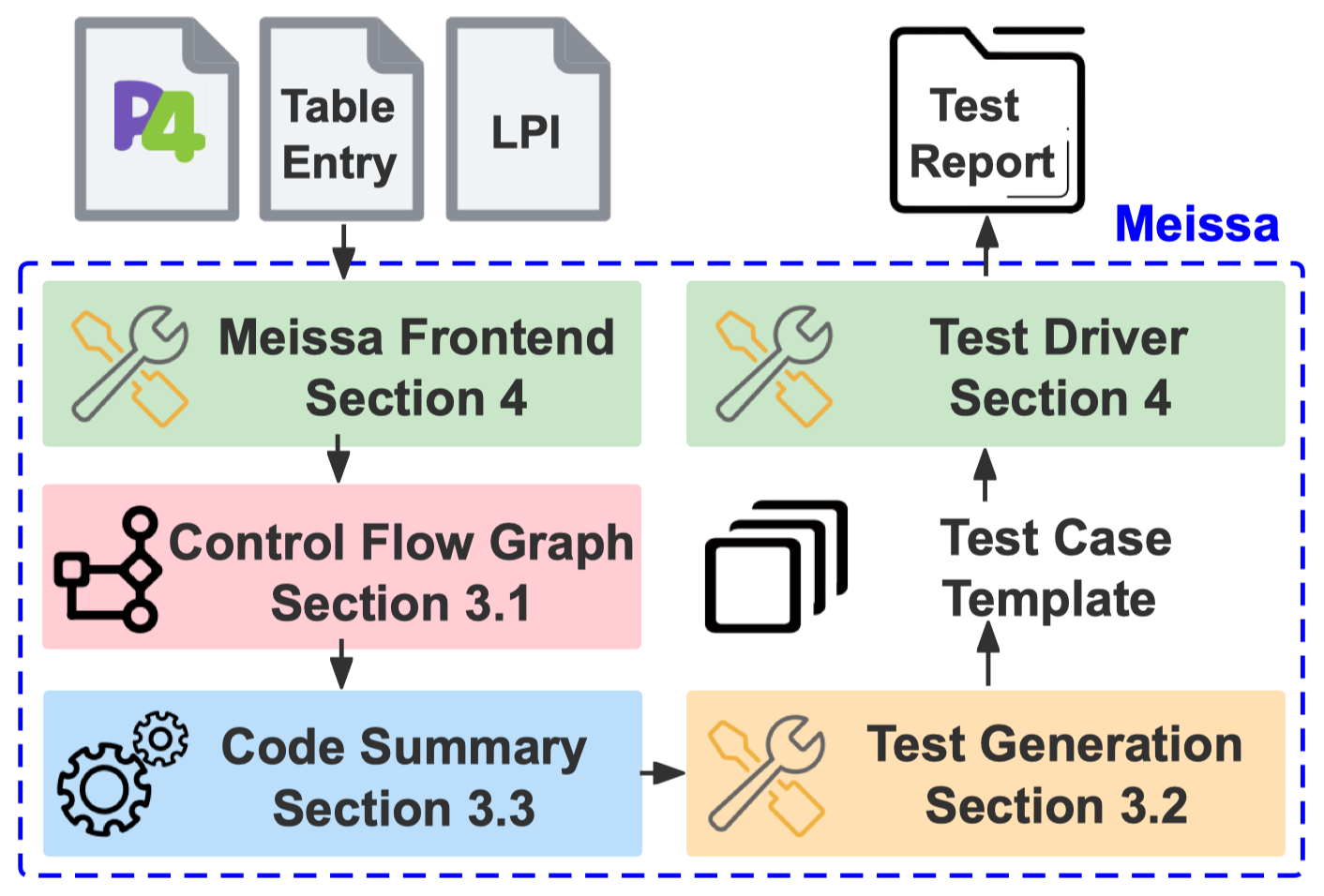 The foundation of software definition lies in the construction of a reliable programmable plane. In the ubiquitous computing environment, various domain-specific hardware (ASICs), hypervisors, and compilers will inevitably produce errors and are intertwined with each other. The paper "Meissa: Scalable Network Testing for Programmable Data Planes" aims at the challenge of programmable data plane reliability problems of multi-source complex errors, and proposes a highly scalable automated testing technology based on domain-specific code summary, which reduces the program control flow diagram without losing coverage, and achieves 100% of production-scale programmable data plane programs Path coverage. The paper was published at ACM SIGCOMM 2022, and the first author is Zheng Naiqian, a 2018 undergraduate student majoring in computer science, which is also the first SIGCOMM paper in China in which an undergraduate student is an independent first author.