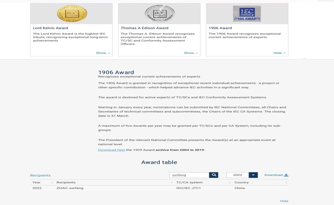 The International Electrotechnical Commission (IEC) is the world's earliest international electrotechnical standardization body, responsible for formulating international standards in the field of electrical and electronics, and is one of the most authoritative international standardization bodies in the world. The "IEC 1906 Award" was established in 2004 to commemorate the establishment of IEC in 1906, to recognize technical experts from various countries who have made outstanding contributions to IEC international electrotechnical standardization, and is one of the three important awards of the IEC. The award is selected once a year, and the finalists are nominated by the chairmen and secretaries of the IEC technical committees, and reviewed and released by the technical officers of the IEC Central Office. Since the establishment of the "IEC 1906 Award", more than 1,000 experts from all over the world have won this award, but most of the award-winning experts are from European and American countries, and the annual "IEC1906 Award" has also become the focus of competition for top experts in the industry.